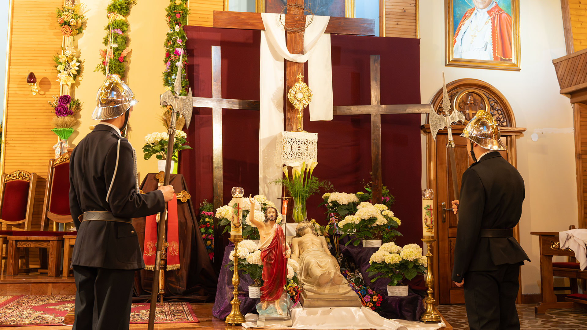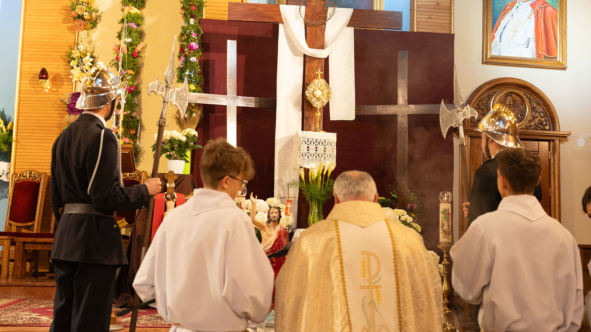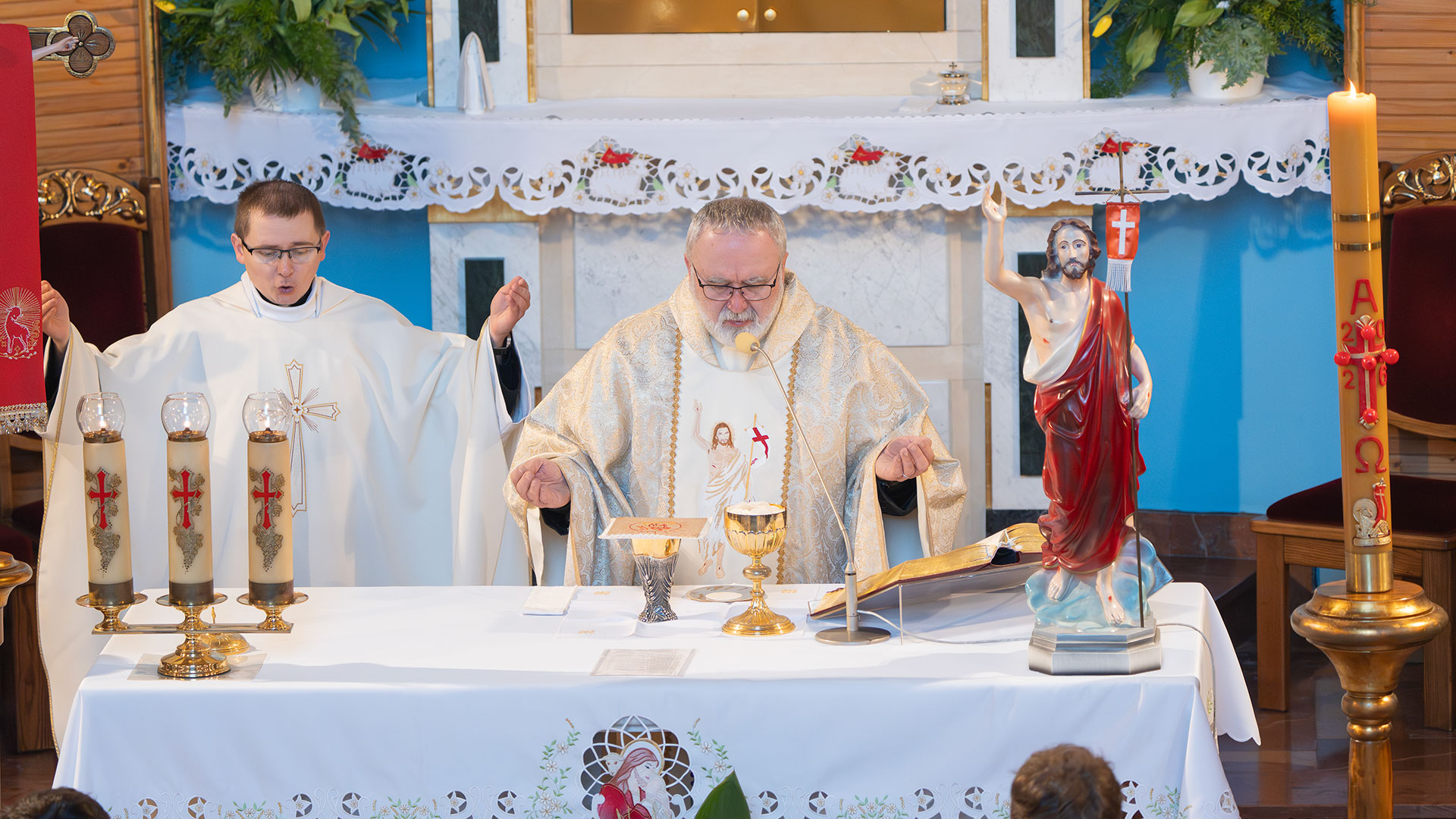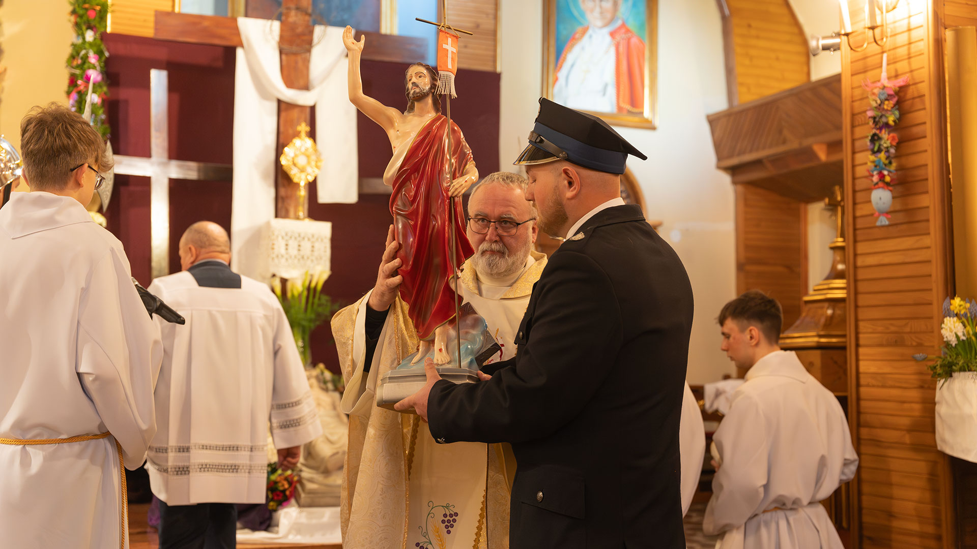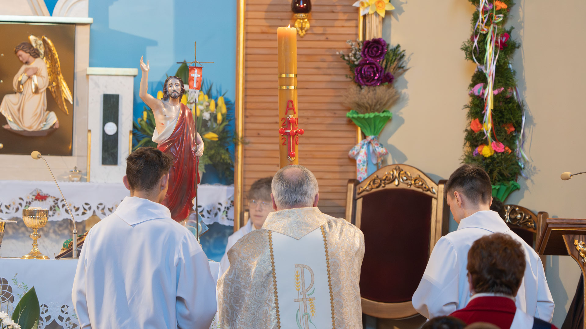 O godzinie 6.00 w Pewli rozbrzmiały dzwony kościelne, które poinformowały mieszkańców o zmartwychwstaniu Jezusa. Uroczystej Mszy Świętej wraz z procesją Rezurekcyjną przewodniczył ks. Andrzej Kolebuk, koncelebrował ją ks. Sebastian Krzak. Podczas procesji towarzyszyły nam orkiestra OSP, panie z Koła Gospodyń Wiejskich w strojach regionalnych, sztandary OSP, Braci Górników oraz Kół Różańcowych.